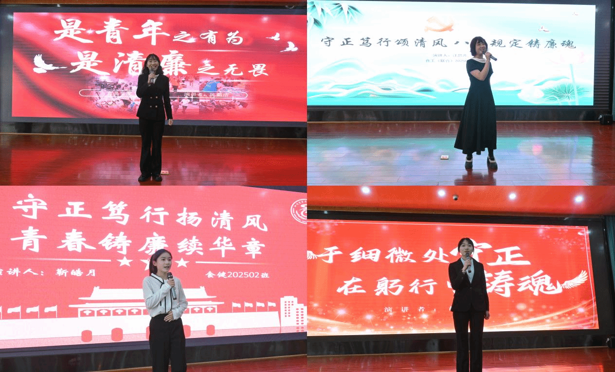 在比赛中,各参赛选手紧紧围绕“守正笃行”“中央八项规定精神”“廉洁清风”等关键词,结合食品专业特色与青年使命,展开了精彩演讲。有的选手从党史的廉洁故事切入,娓娓道来;有的立足食品行业底线,强调“风清则食安,食安则民安”;还有的则以身边榜样为例,呼吁青年学子将廉洁自律融入日常实践。各位参赛选手演讲的内容既有理论高度,又贴近现实生活,展现出食品学子坚定的理想信念与扎实的表达能力,更体现了对中央八项规定精神的深入了解。