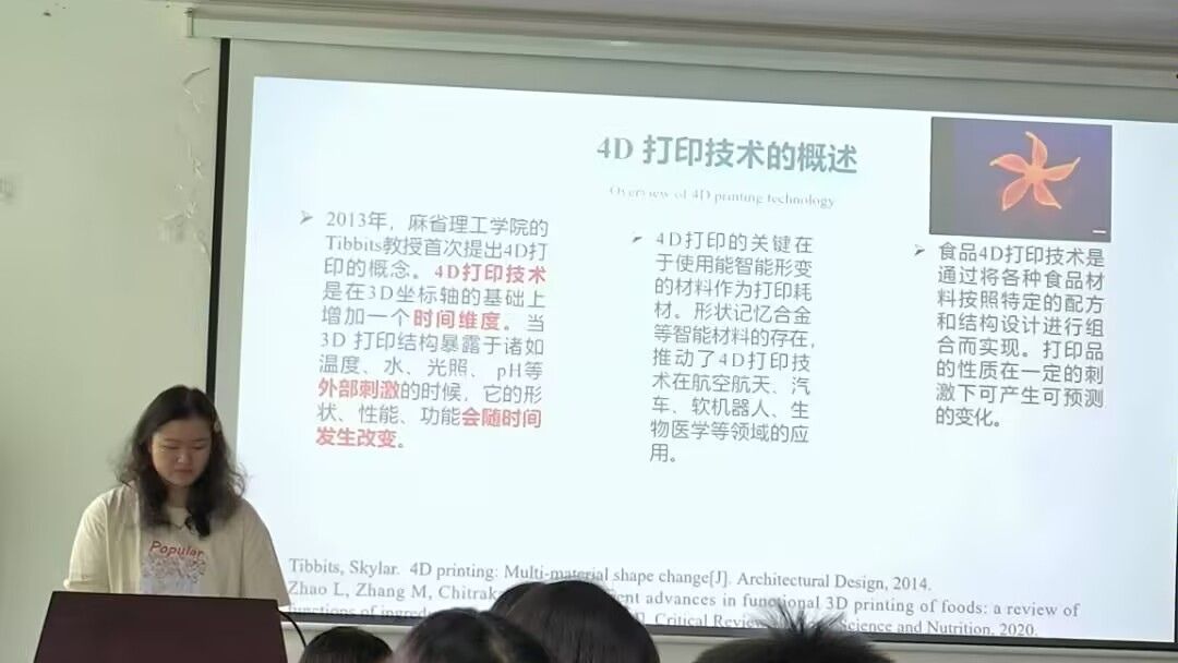 本次沙龙创新采用分组研讨模式。活动中,张春艳小组聚焦科研仪器,深入讲解了真空冷冻干燥机、物性分析仪器、电子鼻及核磁共振等核心仪器的操作流程与数据分析方法,为实验基础技能注入新动能。何思宇小组则从“毒骆驼奶粉”事件切入,深刻剖析了食品中塑化剂的潜在危害,并系统探讨了其安全控制策略,强化了同学们的食品安全风险意识。任婷小组对科研绘图方法和论文写作技巧进行了全面的分享,助力科研效率提升。邓雅文小组引领前沿视野,生动展示了3D打印食品制造、电磁感应加工技术及替代蛋白开发等食品科技尖端领域的最新进展,拓宽了同学们对食品技术开发的视野。