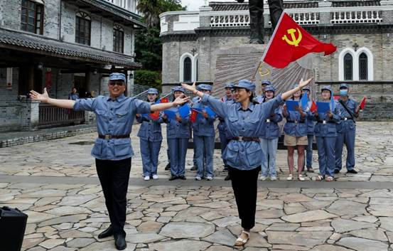在毛主席当年暂住的天主教堂,教师们瞻仰了领袖休息、看书学习的故地,集体向毛主席青铜像致敬,并庄严宣誓,重温入党誓词,进一步增强全体党员的责任感和使命感。随后,还开展了“唱红歌 颂党恩”活动,《唱支山歌给党听》《黄河大合唱》《没有共产党就没有新中国》......各支部教师用心演绎、高声颂唱革命歌曲,歌颂党、歌颂祖国、歌颂新时代,抒发了对党的深厚感情和无限热爱,唱响了党员们牢记使命、奋发进取的号角。