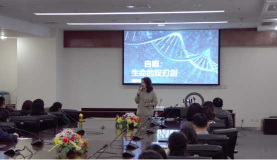 “大家知道什么是自噬吗?”带着这样的提问,罗擎英开始以《自噬:生命的双刃剑》为题做专题报告,围绕近年来生命科学领域的研究热点,从自噬的概念、生物学作用及在食品学科的应用展望3方面进行解读,提到自噬可为微生物研究提供相关思路;对现有保健食品的分子机制可做进一步探究;能为功能性食品的研发及科学使用提供指导。从新方向、新角度启发了在座师生,大家均表示受益颇多。